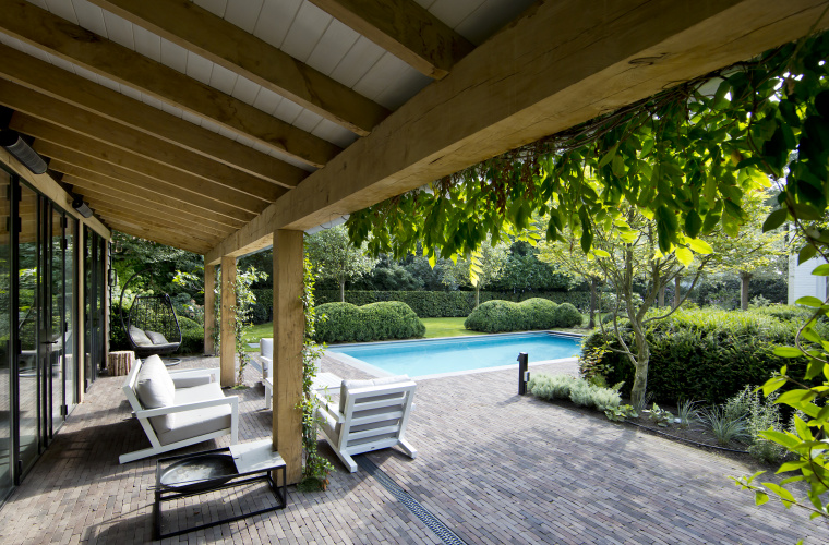 Met de buitenkeuken en het poolhouse naast het zwembad wordt het binnen wonen naar buiten gehaald.